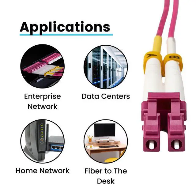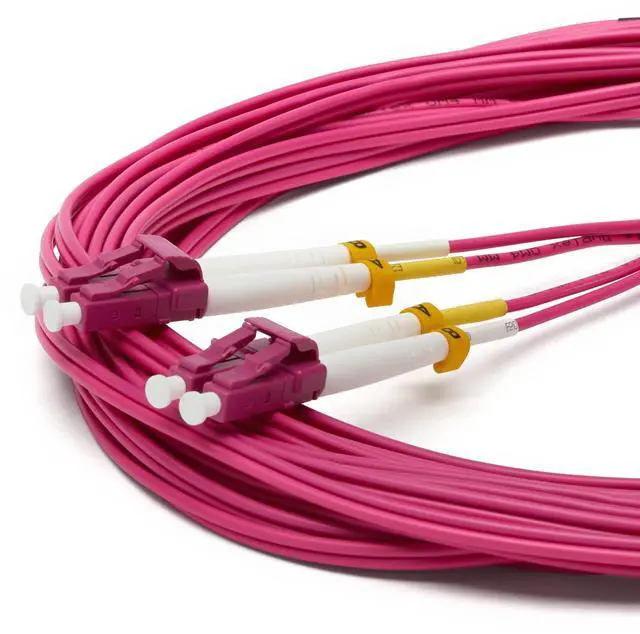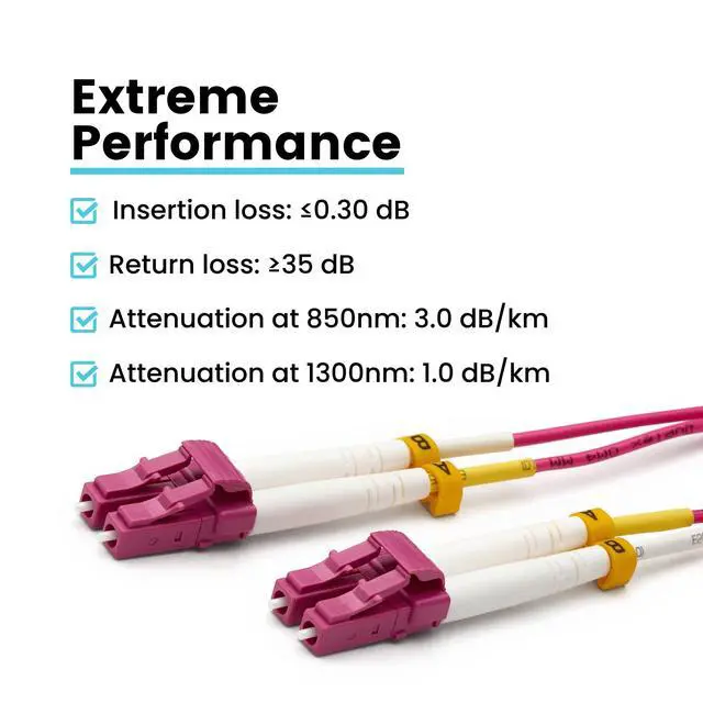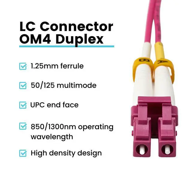 [Extreme Performance] Laser-optimized MMF 850/1300nm operating wavelength for up to 1GB/10GB/40GB speeds with various lengths depending on the transceiver type. UPC or "Ultra Physical Contact" polish on the fiber optic connector ends. Corning glass ultra-bendable, laser-optimized core and cladding. Local Area Network/Data Center & High-Definition Multimedia Interface applications. ^^ [Bend Insensitive] Our LC fiber patch cables are encased with aramid yarn, a tight buffer cable construction with a 7.50 mm minimum bend radius for tight enclosures and sharp turns. The 2.0 mm OD (overall diameter) cable jacket supports high density applications. ^^ [High Quality LC Ceramic Ferrules] Our LC fiber patch cables are made with 1.25 mm superior grade LC zirconia ceramic ferrules to ensure precision alignment and low optical loss.