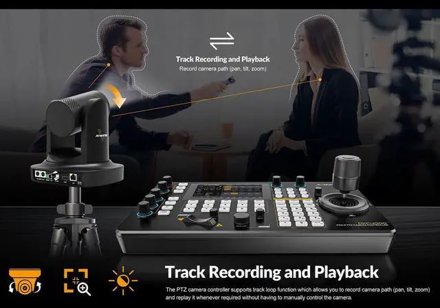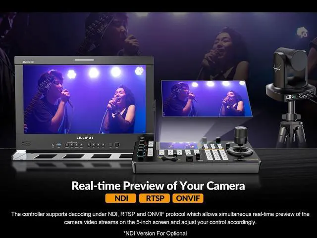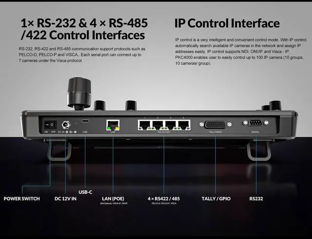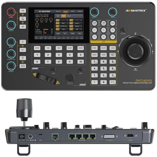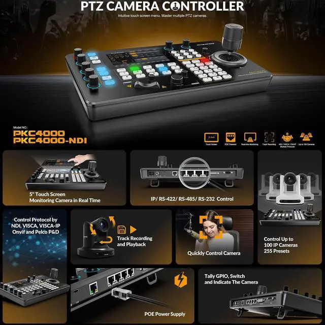 Easy operation with a 5-inch touch screen and 4D joystick Supports video decoding for real-time monitoring Supports Visca, Visca Over IP, Pelco P&D & Onvif protocols Control via IP, RS-422, RS-485, and RS-232 Automatic IP address assignment for quick setup Manages up to 100 IP cameras on a single network 6 user-assignable keys for quick function access Quick control of exposure, iris, focus, pan, tilt, etc. Supports PoE and 12V DC power supply NDI version for optional
