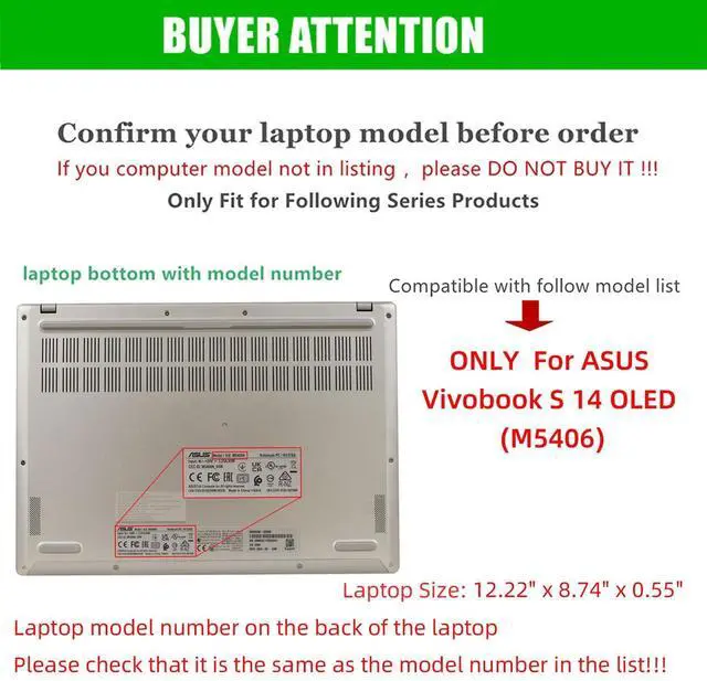 Dimensions: laptop size (L X D X H): 12.22" x 8.74" x 0.55" ~ 0.63". This case is compatible with for ASUS Vivobook S 14 OLED (S5406) 14 inchNotebook PC (Please check your laptop model!!! )