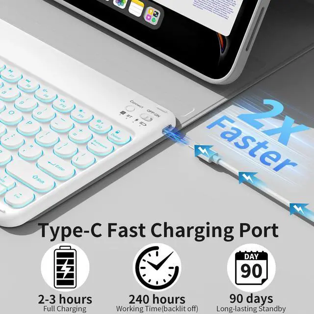 ^^ Long Life Battery Rechargeable KeyboardiPad keyboard Built-in powerful 420mAh battery and enters energy-saving mode automatically if not in use for 15 minutes, which worry-free use and long standby time. Using a Type-C charging port of keyboard charges faster, only 2-3 hours full charge.