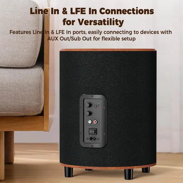^^ Versatile Line In & LFE In Connections Equipped with both Line In and LFE In ports, it easily pairs with soundbars, bookshelf speakers, receivers, DVD/Blu-ray players, and turntables (with Audio Out/Sub Out) for flexible setup. ^^ Whats Included in the Package 1 x 9.96 x 12.92 Powered Subwoofer, 1 x Stereo RCA to 3.5 mm Audio Cable, 1 x AC Power Cord, 1 x Quick Start Guide.