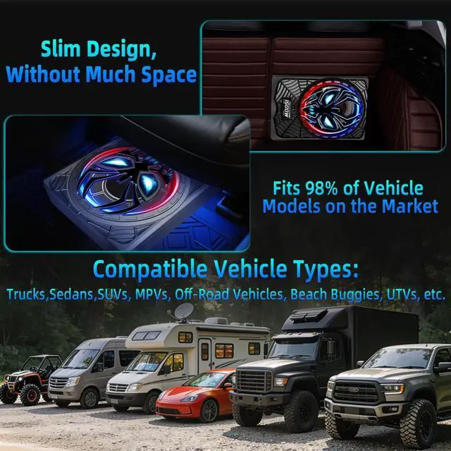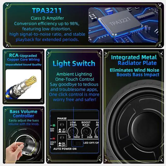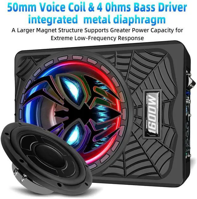 low-pass filter (LPF: 50-150Hz), input gain, and bass boost (0-12dB @ 45Hz). Equipped with a 50mm voice coil and 4-ohm unit, it allows precise tuning to match your music stylefrom subtle low-end enhancement to heart-thumping bass. Tailor your audio experience in seconds, no disassembly or subwoofer adjustment required. ^^ Physical Switch LED Ambient Lights - Rhythm-Sync & Energy-Saving Built-in colorful LED ambient lights with a physical on/off switchsay goodbye to wasted power from uncontrollable lights or tedious app controls. The lights sync dynamically with music rhythm, creating a personalized in-car vibe that boosts driving pleasure and visual appeal. One-click operation ensures easy use and energy efficiency, perfect for daily commutes and long road trips. ^^ Efficient Heat Dissipation & Multi-Protection - Durable & Stable Performance Scientific exterior design and an intelligent built-in heat dissipation system enable long-term high-power operation without overheating. Equipped with full protection mechanisms (short circuit, overload, overheating protection), it safeguards the subwoofer from damage, ensuring safe, reliable performance. Enjoy consistent, surging bass for yearseven during extended drives or high-volume use.