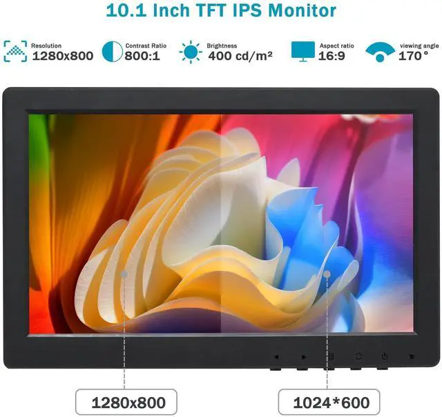 ^^ 10.1" TFT IPS MonitorOSCY 10.1 inch LED security computer monitor with HD 1280*800 resolution, 60HZ, 800:1 dynamic contrast ratio, 400 cd/m2 brightness, 16:9 aspect ratio and 170 wide viewing angle, bright saturated images and high colour reproduction will bring you pleasant visual enjoyment. ^^ Small and PortableThis 10 inch small HDMI monitor for computer is lightweight. It's easy to pack in a bag when travelling, and you can also carry it in a car, RV or truck. Portable LED display screen is also ideal for home entertainment, you can place it in the kitchen, bedroom or bedside table.