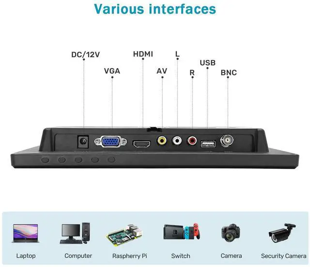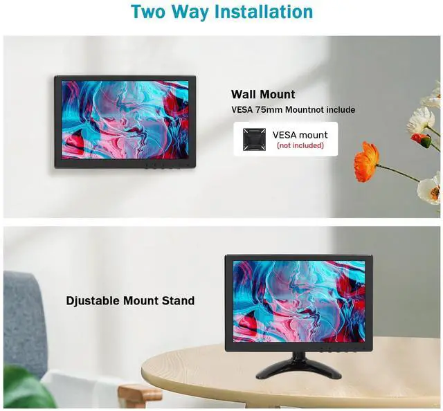 Various interfacesThis small computer monitor offers multiple input ports, connects to almost any device. HDMI (gaming, Raspi, computers, laptops, DVR or other devices with HDMI connectors)VGA (PC, laptop)AV(DVD, VCD, TV-Box, security cameras with AV connectors)BNC(CCD, CCTV)USB. ^^ Two-way Mounting & 170 Wide Angle ViewingThis display can be easily mounted on a wall with the industry standard VESA 75mm bracket (not included) or on a desktop with supplied the adjustable bracket. The 170 horizontal and vertical viewing angles provide a clear view of the screen from a variety of angles.