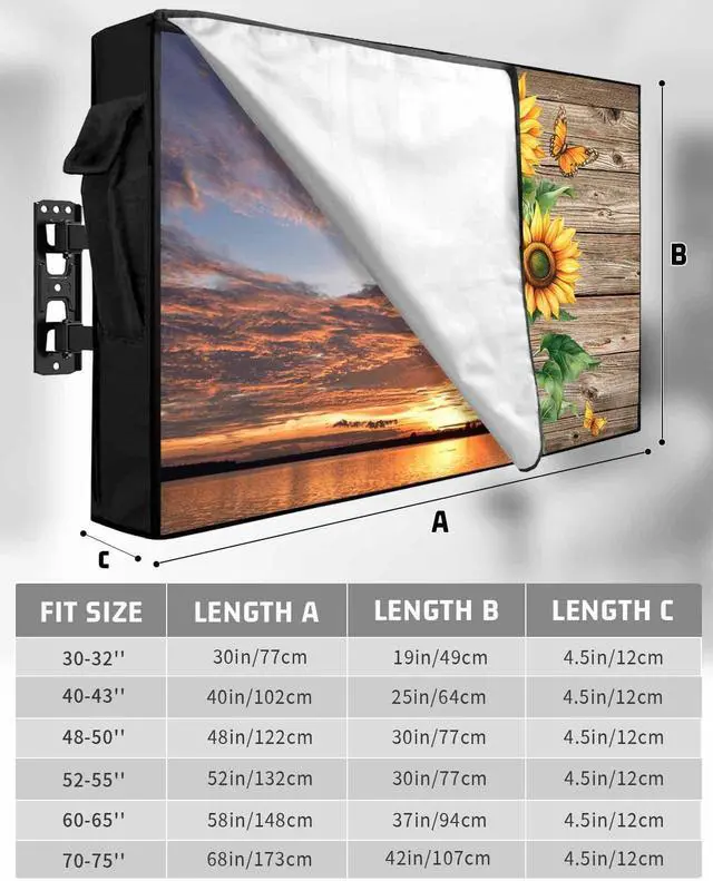 Outdoor TV Cover Size Chart30-32in /30x19x 4.5 in32 in smart tv40-43in /40x25x 4.5 in43 inch smart tv48-50in /48x30x 4.5 in50 inch tv52-55in /52x30x 4.5 in55 inch tv60-65in /58x37x 4.5 in65 inch tv70-75in /68x42x 4.5 in75 inch tvOutdoor TV Protector DesignFull coverage design avoids damage from the vivid elements, making your outside television always look like new. Warm TipsPlease measure the size of your TV accurately before purchasing a TV cover. Store the remote in the cover pocket. When youre ready to switch off and head indoors, always remember to place the remote inside its pocket on your outdoor TV cover.
