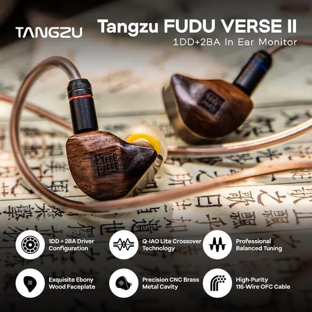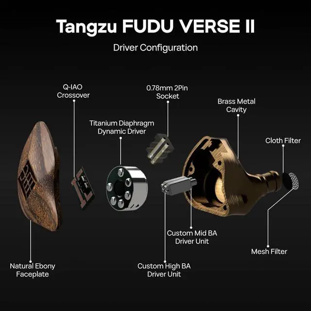 ^^ -: Derived from Tangzu's acclaimed Q-IAO system, this advanced Q-IAO Lite Crossover technology optimizes driver coordination for the DUFU VERSE II's 3-driver setup. It enables seamless integration between drivers, precise tuning of frequency ranges, and eliminates phase inconsistencies, to deliver a balanced, detailed sound with remarkable clarity, minus unnecessary complexity ^^ - - -: The DUFU VERSE II features a 0.78 mm detachable cable design for easy replacement or upgrades. This high-purity 116-wire oxygen-free copper cable is selected to deliver superior audio performance and durability, boasting optimized signal transmission and reliable, immersive