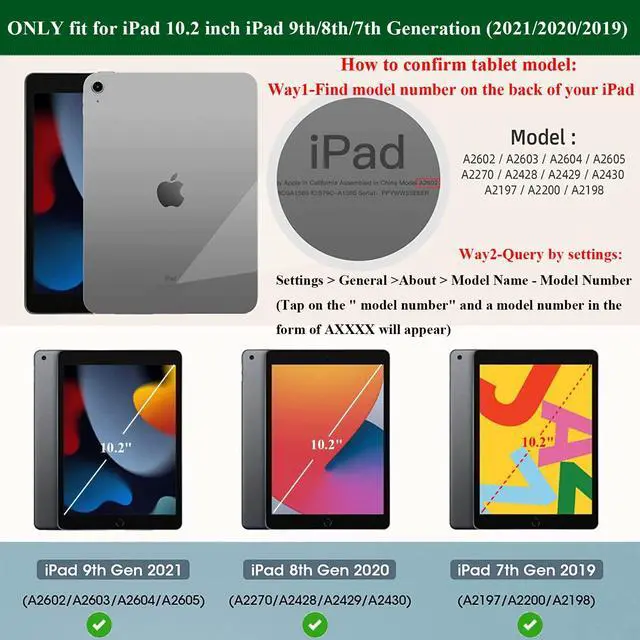 Number: A2603 / A2604 / A2605 ); iPad 10.2 inch (2020) (iPad 8th Generation), (Model: A2270/ A2428/ A2429/ A2430); iPad 10.2 inch (2019) (iPad 7th Generation), (Model: A2197/ A2198/ A2200); NOT for other tablet model.