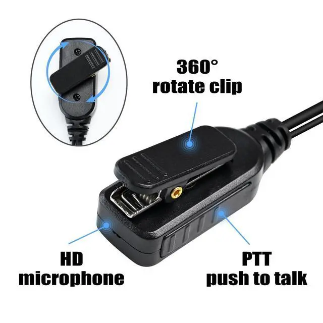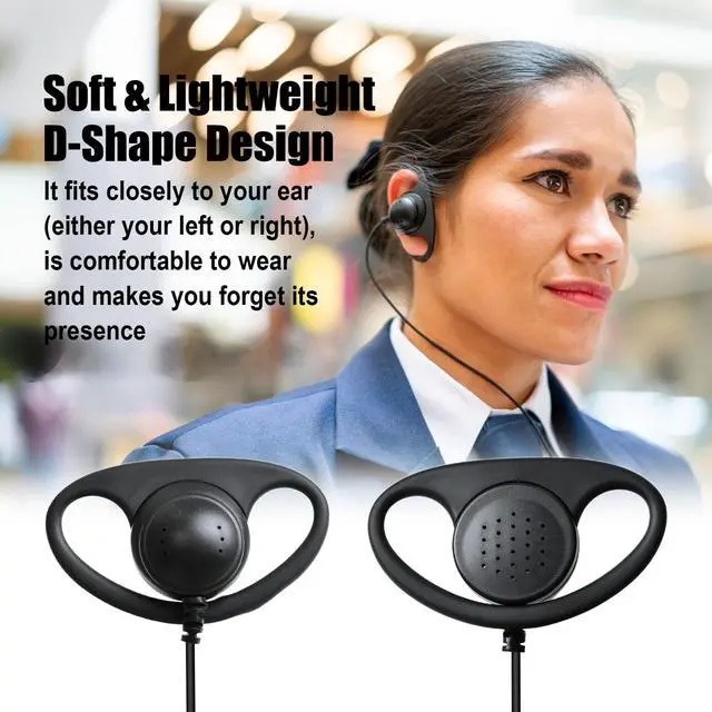 ^^ Soft & Lightweight D-Shape DesignIt fits closely to your ear (either your left or right), is comfortable to wear and makes you forget its presence ^^ Dual-Wired PTT (push to talk) with Built-in MicrophoneEasy to operate, instant communication with clear sound, the clip can be attached to the collar for easy communication ^^ Durable Cable Construction TPU Wire cable for greater durability; clearly transmit voice in extreme noise situations ^^ Professional Application Excellent for use in FBI, Bodyguard, military, nightclubs, bars, paintball, security, restaurants, hotels, bouncer, warehouses, airports, casinos, manufacturing plants, conventions and noisy environments ^^ Package Included1 headset