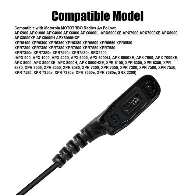 Compatible ModelCompatible with Motorola APX Series Radios APX 6000, APX 6500, APX 7000, APX 8000, APX 6000LI, APX 8000HXE. XPR Series Radios XPR 6000, XPR 6100, XPR 6300, XPR 6350, XPR 6380, XPR 6000, XPR 7000, XPR 6500, XPR 6550, XPR 6580, XPR 7300, XPR 7350, XPR 7380, XPR 7500, XPR 7550, XPR 7580, XPR 7350e, XPR 7380e, XPR 7550e, XPR 7580e. XIRP Series Radios XiR P8200 XiR P8208 XiR P8260 XiR P8268 XiR P8608 XiR P8660 XiR P8668 GP Series Radios GP328D GP338 GP328D+ GP338D+ DP Series Radios DP3400 DP3401 DP3600 DP3601 DP4400 etc.