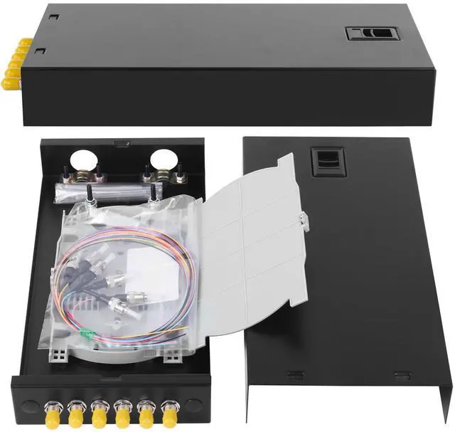 6 Simplex ST-UPC KitWall Mount Fiber Enclosure with Spool 6 Strands 1.2m ST Pigtail, Fiber Type 0.9mm 9/125 SingleMode G.625D; The snap on design allows for quick installation and maintenance. No need to tighten screws.