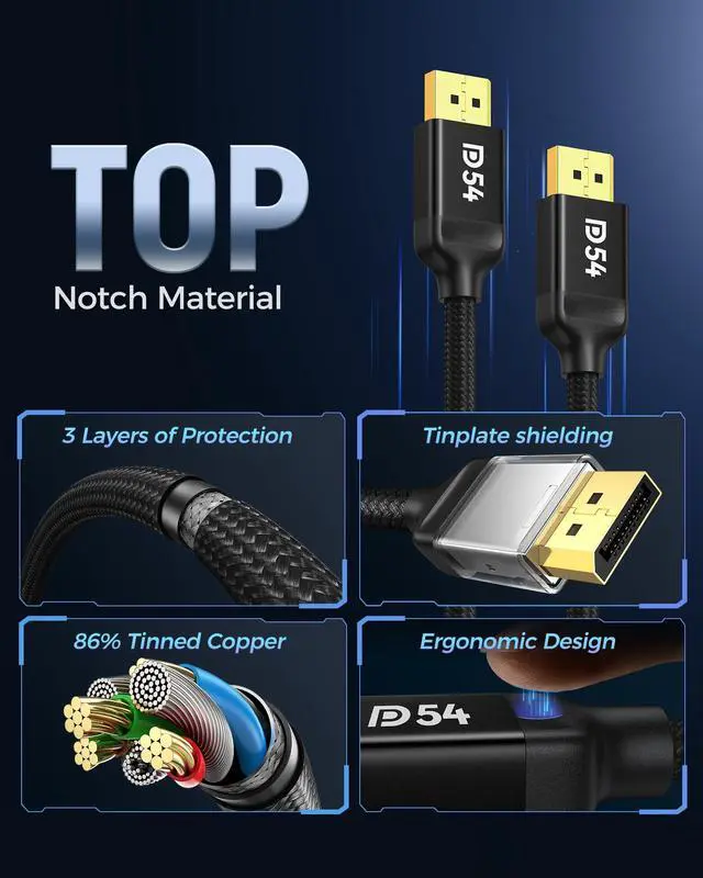 Experience enhanced visuals through Dynamic HDR and immersive 32-bit audio for FPS and AAA games. Enjoy multi-screen gaming with MTS multi-stream transmission. This all-in-one DisplayPort cable sets the bar for the next decade ^^ Ergonomic Design & Anti-InterferenceSilkland DP Cable features a sleek, buckle-free and groove design for added protection and easy removal in tight spaces. The 28AWG tinned copper conductor with triple shielding ensures high resistance to EMI interference. 10x more durable than PVC cables. The double nylon braided cable and 24K gold plated connectors provide artifact-free and synchronized audio/video transmission. Say goodbye to accidental damage and enjoy a seamless experience ^^ Wide CompatibilityOur DisplayPort to DisplayPort cable ( 2.1 / 2.0 )