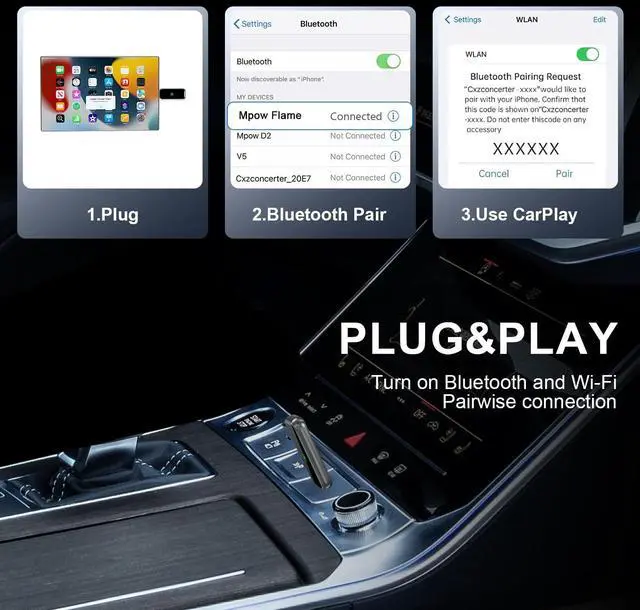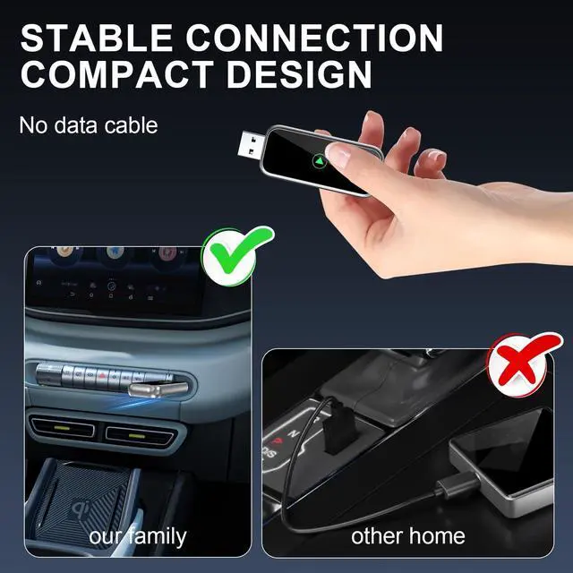 Upgrade to Wireless CarPlay & Android Auto Instantly convert your factory wired Apple CarPlay or Android Auto system to wireless in seconds. Enjoy hands-free navigation, music, calls, and voice control without plugging in your phoneno more cables, clutter, or distractions while driving ^^ Fast Auto-Reconnect, Plug & Play Simply plug in the wireless CarPlay adapter, pair once, and it automatically reconnects every time you start your car. No apps, no setup hassleyour phone stays connected even in your pocket or bag ^^ Wide Compatibility for Cars & Phones Compatible with iPhone 8 and newer (iOS 10+) and Android phones running Android 11+.