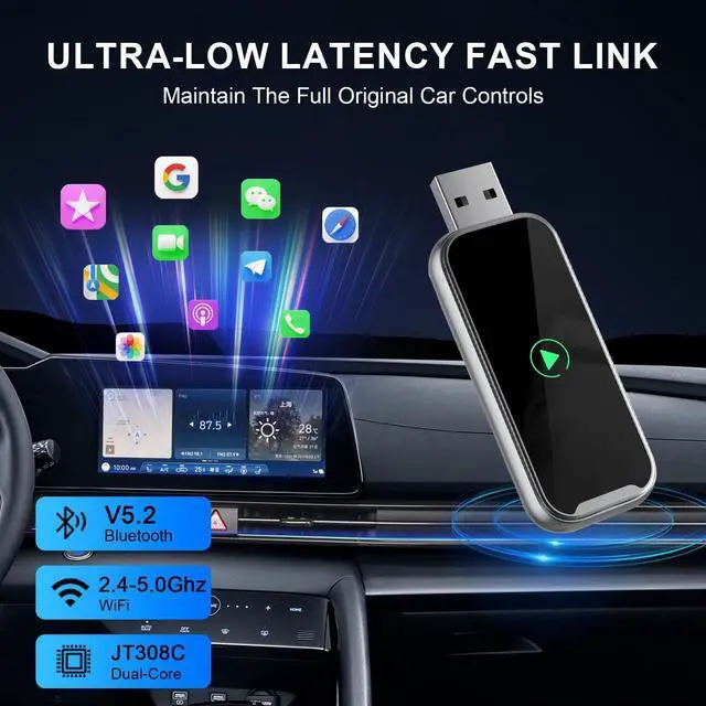 Includes a USB-A to USB-C adapter, making it suitable for most vehicles with factory wired CarPlay. Easily switch between iOS and Android devices ^^ Stable Connection with Advanced Chipset Built with an upgraded high-performance chip and 5GHz Wi-Fi technology for fast response and smooth, lag-free performance. Fully supports steering wheel controls, touchscreen, knobs, and original vehicle systems, plus Bluetooth 5.2 support ^^ Premium Design & Reliable Support Features a compact zinc alloy body with a heat-dissipating glazed panel for durability and long-term use. Small, sleek, and reliable for daily driving.