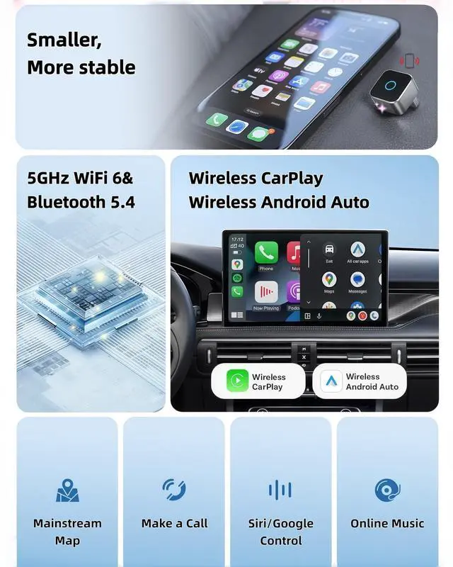 Bluetooth 5.4: 160MHz ultra-wide channel, minimal interference, 9.6G bps peak speed, ultra-low latency. Dual-band ( 2.4GH z+5GHz) support combines fast WiFi 6 transmission and low-power Bluetooth for instant, smooth, hassle-free in-car connectivity. ^^ 2 Phones? No Sweat"Work + personal phone? Can it keep up? "Heck yeah. This 2-in-1 wireless CarPlay & Android Auto adapter remembers both devices. Hop in, and youre reconnected in 58 seconds flat. ^^ Sick of Cable Clutter? Same HereWhos not over that spaghetti mess of wires? Ditch the cords this wireless CarPlay dongle keeps your dash clean and clutter-free. And guess what?