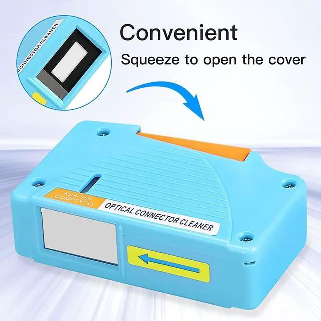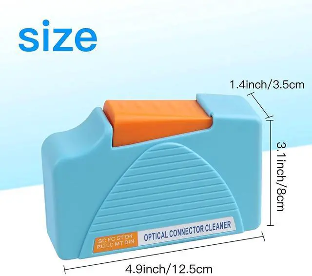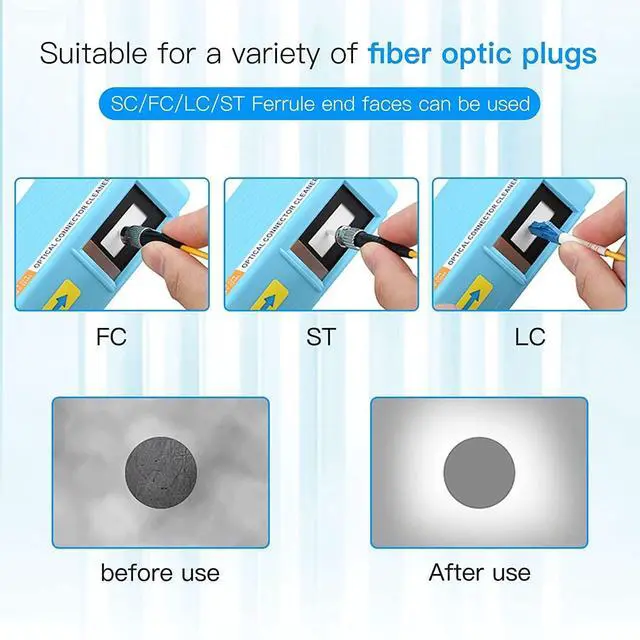 Antistatic PropertiesIt can effectively avoid re-adhesion of dust after the fiber is cleaned. ^^ Good cleaning Performance It can easily remove dust, oil and other debris from the ferrule to provides high-quality end face and connector finishes without the use of alcohol or solvents. ^^ More than 500 CleaningRecycle clean times up to 500+, Ergonomic, comfortable design with single action cleaning, also serious stain can be cleaned at once and the cleaning belt in the cleaner can be replaced. ^^ Application Suitable for cleaning LC/SC/FC/ST/MU/MTP/MPO/D4/DIN connectors. ^^ Brand Service12 months after-sales service gives you a good shopping experience.