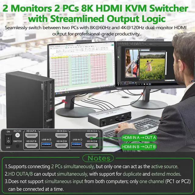 Monitors: Supports connecting two computers simultaneously, but only one can act as the active source. Both monitors can output simultaneously, with support for duplicate and extend modes. Does not support simultaneous input from both computers; only one channel (PC1 or PC2) can be connected at a time.