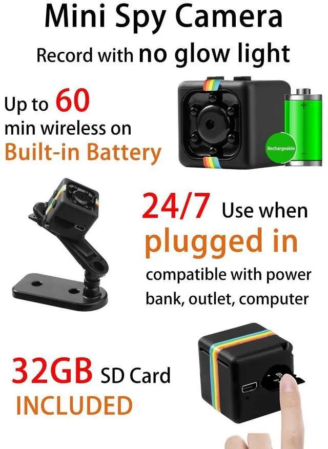 Crystal-Clear 1080P Video & 12MP Photos Never miss a moment! This mini camera captures every detail with sharp video and vivid photos, perfect for keeping your home or adventures safe. ^^ Works Anywhere, No Wi-Fi Needed The spy camera comes with a pre-installed 32GB memory card and is ready to use instantly no complicated setup required. ^^ Long-Lasting Battery The no wifi security camera runs up to 100 minutes on a single charge and can be used continuously while charging, keeping you always covered. ^^ Tiny, Portable & 360 Flexible At only 0.87 inches, this small camera goes anywhere.