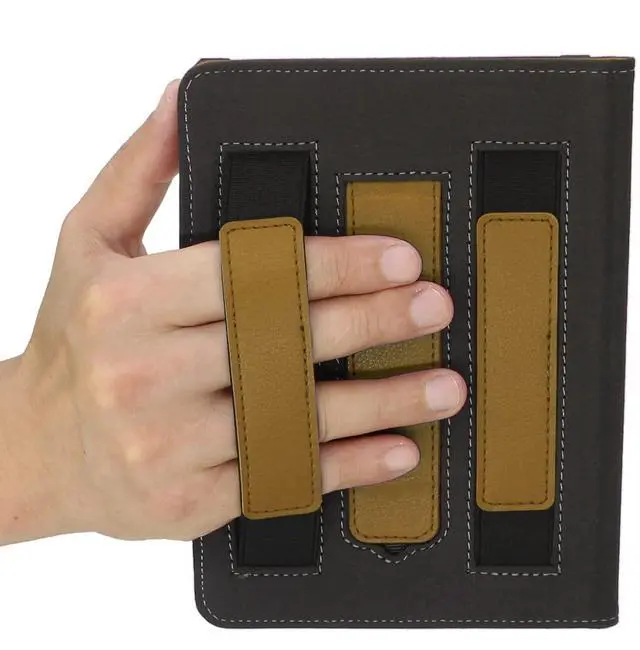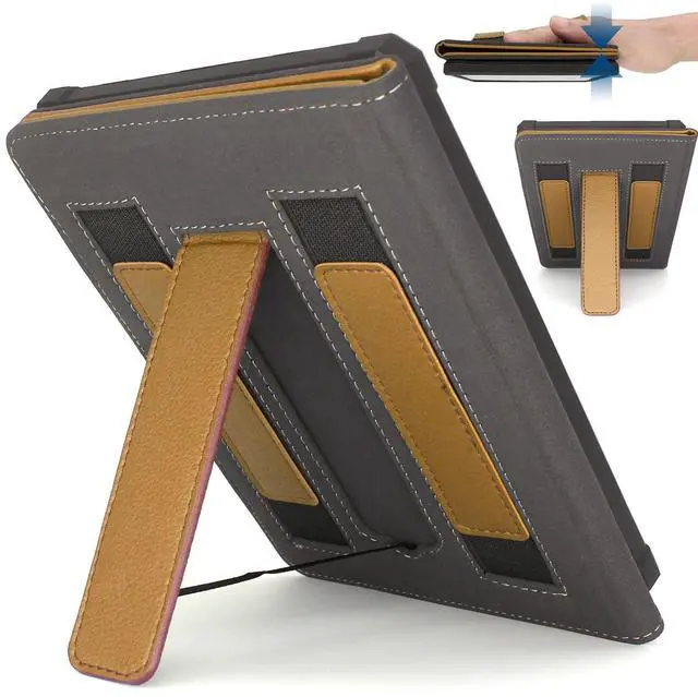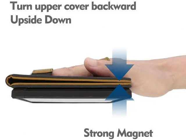 There are two straps / handles inside the protective case that allows your hand to pass through it while holding the e-reader for reading. ^^ It can stand up on the table. ^^ When the upper cover is turned around for reading, it will be attracted to the back of the lower cover by magnetic force, and the force is strong enough to hold them together, you can slide your hand through the strap and hold it upside down for reading when lying flat in bed. ^^ With automatic hibernation and wake-up function.