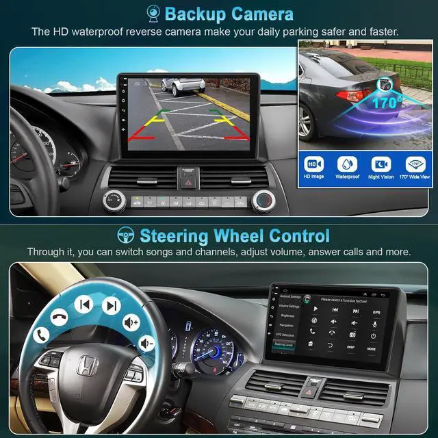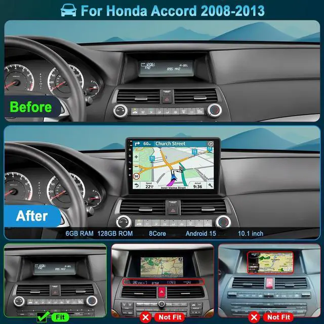 Compatible VehiclesFits For Honda Accord 2008 2009 2010 2011 2012 2013 (fit the original car without Navigation and Large Screen); Please check the year, dimensions and shape of the center console of your vehicles before purchasing. ^^ Wireless CarPlay and Android AutoThis Accord Upgrade Replacement is compatible with wireless/wired CarPlay and Android Auto, you can make hands-free callings with the help of Siri or Google Assistant, and is easy to get phone contacts, emails, notifications, map navigation, music, videos and more. It means that you can focus more on road safety while driving.