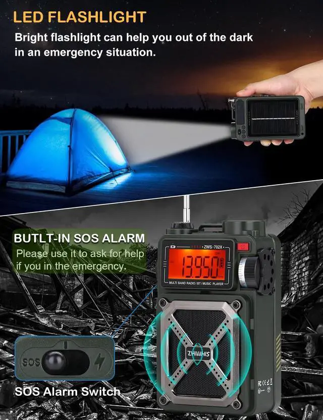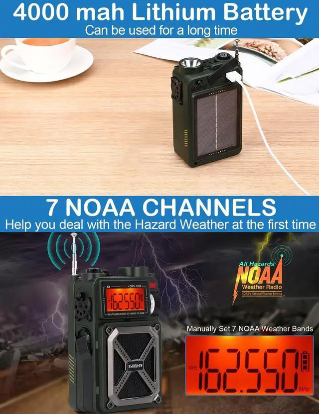 AM FM SW WB radio: This shortwave radio can receive AM (520-1710KHz), FM (87-108MHz), SW ( 4.75 - 21.85MH z; ), and WB ( 162.400 - 162.550MH z) bands. You can switch the radio mode to meet your needs. The shortwave radio has a built-in NOAA weather band, which can automatically scan 7 NOAA weather channels (US/CA) to receive the latest weather forecast (Weather/Emergency/All Hazard). 3. Hand crank/solar/SOS alarm/white noise/bass/rechargeable retro receiver: Our retro radios have multiple power supply modes. The shortwave radio also has a built-in 4000mAh. 4. ZHIWHIS NOAA weather/AM/FM portable hand crank solar radios with SOS alarm, battery-powered, and built-in 4000mAh, flashlight, and reading lamp for camping, hurricane, home. This is a multi-functional emergency radio. When there is a power outage, use a hand crank to generate electricity and use it.