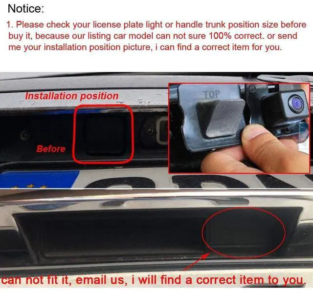 Dear customer, please must check the camera size and appearance before place a order, see if can fit your license light place size and appearance! Because the same car model in different countries may have some difference, please check the camera size and compare the installation of your car carefully to avoid mistake.