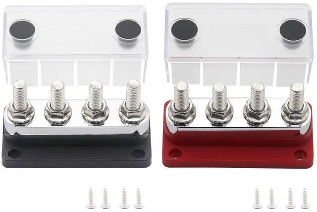 What You Get: 1x 600A positive bus bar with 4x 3/8" studs terminal ( red), 1x 600A ground bus bar with 4x 3/8" studs terminal ( black), 2x covers ( transparent), 8x Screws