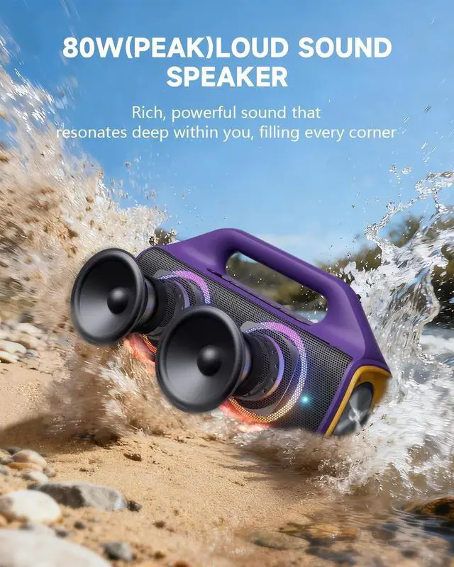 IMMERSIVE OUTDOOR SOUND WITH POWERFUL BASS: This best portable speaker features dual 3.6 -inch full-range drivers with a peak power of up to 80W, delivering deep bass, while a built-in DSP chip adds clarity to the sound. Whether at a party, beach, sports event, or camping, this large speaker can transform any outdoor space into a vibrant musical haven. ^^ IP67 WATERPROOF, DUSTPROOF