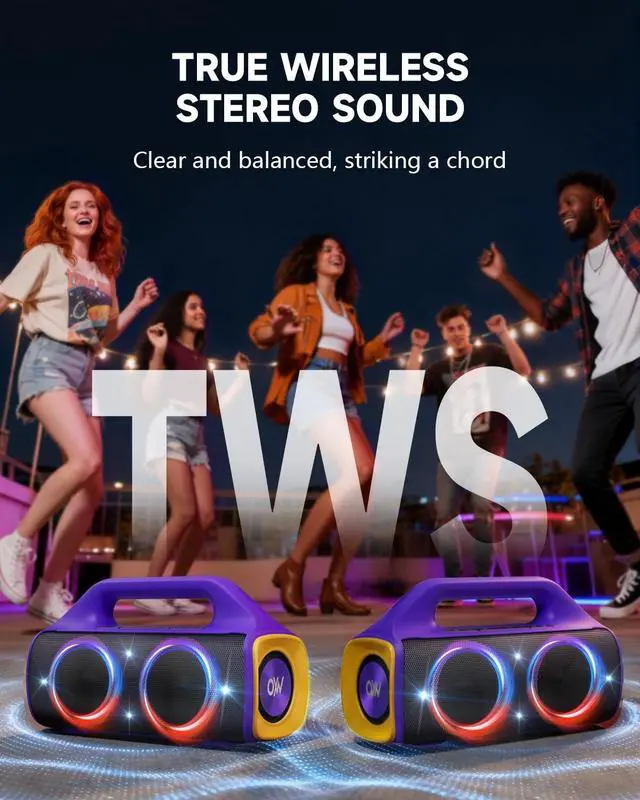 DYNAMIC LIGHT SHOW: Connect two bluetooth speakers via TWS to enjoy immersive stereo surround sound. Synchronized with dynamic RGB lighting effects, the lights move in sync with the music, creating an audio-visual feast atmosphere. The outdoor speakers is ideal for parties and outdoor events. ^^ MULTI-CONNECTION & PORTABLE VERSATILITYThe bluetooth surround sound speakers connect easily via Bluetooth 5.3, AUX input, or USB flash drive. Compact, lightweight, and designed for easy carrying, This stereo speaker s are your go-to speaker for travel, camping, hiking, and impromptu outdoor parties. ^^ 20-HOUR ULTRA-LONG BATTERY LIFE AND REVERSE CHARGING: The party bluetooth speakers with bass offers up to 20 hours of continuous playback, providing uninterrupted music and entertainment from sunrise to sunset. This bass speaker bluetooth with its built-in power bank function, you can charge your phone or other devices anytime, anywhere no more worrying about running out of battery during long trips.