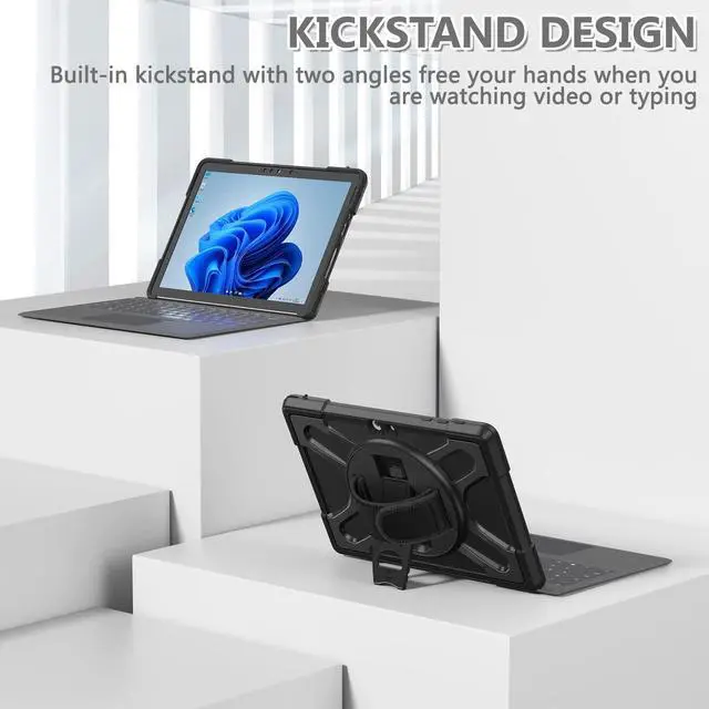 Model]: Designed for Microsoft Surface Go 4 (2023) 10.5 Inch / Surface Go 3 10.5 Inch 2021 / Surface Go 2 10.5 Inch 2020 / Surface Go 10 Inch 2018. ^^ Great Hand Grip for on the move Reading & Media Consumption----- because I am on the move alot and I need to be in the right State of Mind/Mood in order to be comfortable enough to settle down to read. This helps alot with accessing my Ebooks on the go. Generally, high quality, rugged and simple. ^^ The kick stand and 360 velcro hand strap both work vary well-----Kickstand on the back, flexible in vertical & horizontal any other angles ideal for watching video, reading or teaching, maximinzely free your hand. Stretchable handle grip, perfectly suitable use for all size of hands, adults, students, child ^^ Compatible with Microsoft Type Cover Keyboard-----Our tablet case is compatible with