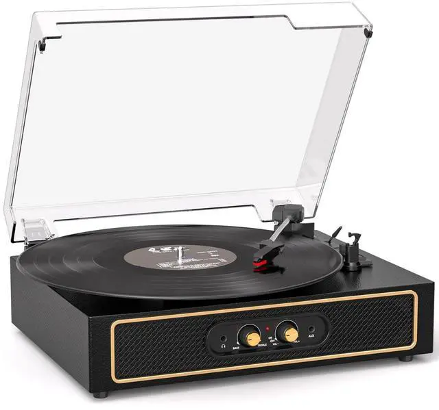 Adjust your bass and treble easily to personalize your sound. Multiple output options RCA, AUX, and headphone jack allow you to connect external speakers or enjoy private listening. The transparent dust cover not only protects your vinyl collection but also showcases the timeless beauty of your setup. Perfect as a gift for music lovers, family, or friends, this vinyl record player transforms any space into a cozy music corner. Compact, stylish, and versatile its a beautiful way to bring analog warmth into your modern life.