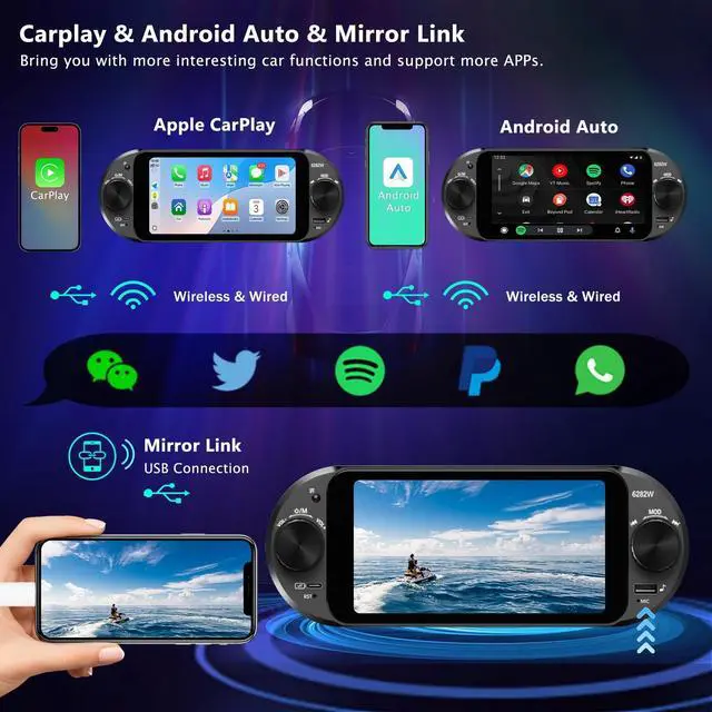 Wireless/Wired Apple CarPlay & Android Auto Effortlessly connect your iPhone or Android device via wireless or USB for hands-free navigation, calls, and music. Ideal for daily commutes, weekend drives, or long road trips with clear, intuitive control through your carplay screen for car. ^^ 6" HD IPS Single Din Touchscreen Radio (1440720) Enjoy a vibrant, large 6-inch screen with high resolution for maps, media, and apps. Wide viewing angles ensure clear visibility in sunlight or low-light conditions, making this single din touchscreen radio perfect for family trips or city driving.