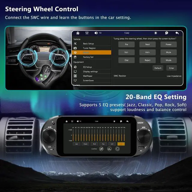 ^^ FM/AM Radio & 20-Band EQ Tune into 6 FM presets and AM broadcasts for news, traffic, or entertainment. Customize your sound with a 20-band equalizer to match your music styleideal for audiophiles or long highway drives, providing a rich and immersive in-car audio experience. ^^ Bluetooth 5.2 & External Mic Stream music and take hands-free calls effortlessly with stable Bluetooth 5.2 connectivity. The external microphone ensures crystal-clear voice pickup even on highways or crowded streets. ^^ Dual Knob Controls & Oval Design Adjust volume and tuning precisely with the dual knobs, even when wearing gloves or driving on bumpy roads.