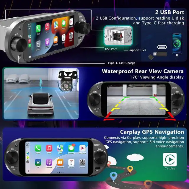 The stylish oval design adds a modern touch while keeping control tactile and intuitive. ^^ USB & Type-C Fast Charging Charge devices quickly with Type-C (1838W) and USB ports, while simultaneously playing media. Perfect for long trips or navigation-intensive drives, ensuring your devices stay powered without interruption. ^^ 8-LED Night Vision Backup Camera & SWC Reverse confidently with a wide-angle, night vision-enabled backup camera. Combined with steering wheel controls, you can manage music and calls safely without taking your hands off the wheel, ideal for parking in tight spots or city streets.
