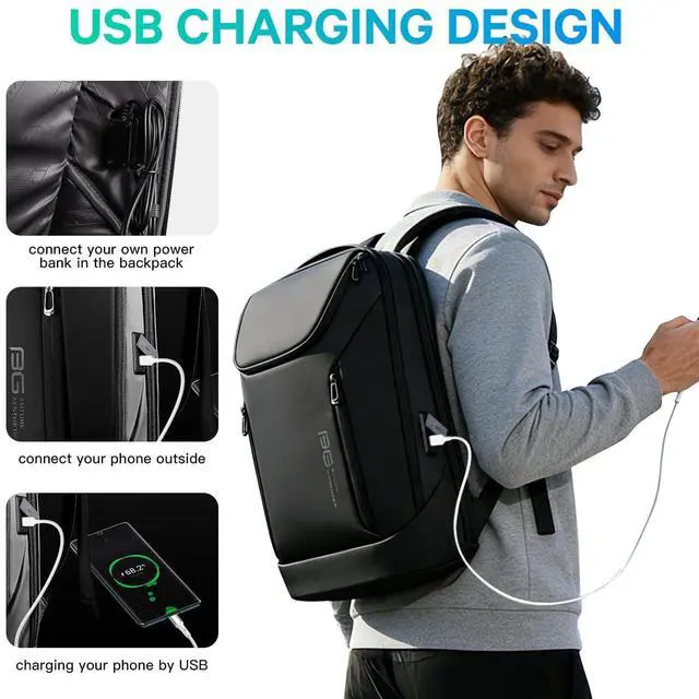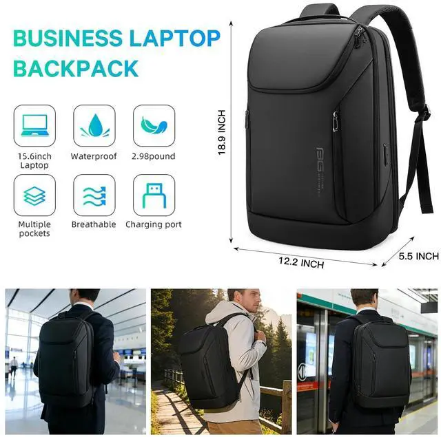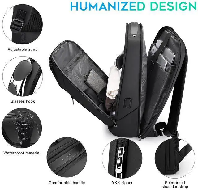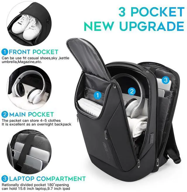DescriptionThe laptop backpack is USB version revision be a more minimalist design, so the backpack no USB charge port and reduce a function such no two side small pocket and the shoulder strap no ID card pocket, glasses hang bucks, so choose suitable yourself ones the commute backpack can hold 15.6 inch laptop, The front pocket can be use fit casual shoes, sky, 9.7 ipad, Magazine and Other small thing, the main pocket can contain 4-5 clothingand the the laptop pocket compartment can hold 15.6 inch laptop. the side have a pocket can store kettle, umbrella.