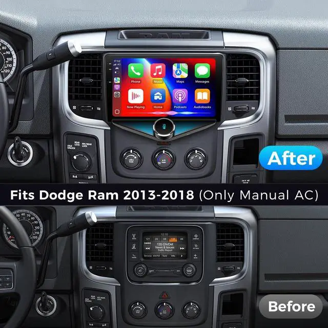 ^^ 9" QLED Touchscreen Car Stereo with Bluetooth Features a 9-inch QLED touchscreen with 1360x800 HD resolution, paired with 3GB RAM + 32GB ROM for quick response and smooth operation. Supports online & offline GPS navigation, Wi-Fi connectivity, Bluetooth 5.4, and FM/AM radio, enhancing both functionality and dashboard aesthetics in your Dodge RAM. ^^ Wireless CarPlay & Android Auto with Voice Control Supports wireless Apple CarPlay and wired or wireless Android Auto (Bluetooth & USB). Easily access navigation, phone calls, music, messages, and apps directly from your iPhone or Android device on the large HD display.