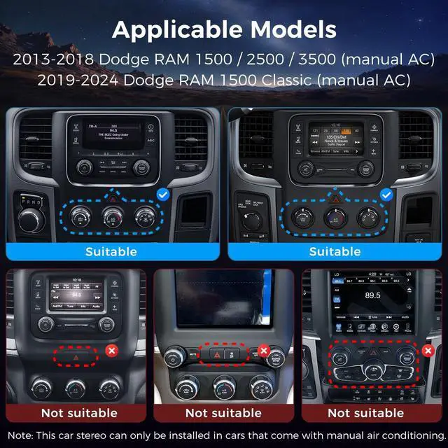 Applicable ModelsThis Android 14 car stereo is custom-designed for Dodge RAM 1500 / 2500 / 3500 / 20132018 (Manual AC only). Plug-and-play installation ensures a factory-style fit with no cutting or modification required. Please confirm your vehicle year and center console size before purchasing. ^^ Android 14 System & Rockchip High-Performance Processor Powered by the latest Android 14 OS and an upgraded Rockchip high-performance processor, this Android head unit delivers faster boot-up, smoother multitasking, and lower power consumption compared to ordinary systems. Enjoy stable, lag-free performance for navigation, music, and daily app use.