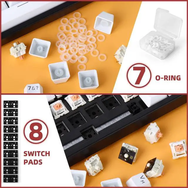 CHARACTERISTICSThis is a kit for keyboard customization enthusiasts, Switch pads is made of Poron high quality memory foam, good sound absorption, Switch film can also fill the voids between housing and upper, Make your switches more stable while typing, The O-rings is about 1.5 mm thickness, can help you shortens actuation distance. ^^ SWITCH LUBEJRX 205G0 Grease is a synthetic grease that we have personally tested and researched for high temperature stability, good compatibility, Used for keyboard switches, keyboard stabilizers and precision instruments, Enough for 350 switches. ^^ ALUMINUM SWITCH OPENERThis is a two-in-one switch opener, used for Cherry MX, Akko, Kailh, TTC, Tealios, Zealios, Holy Panda Switchs.