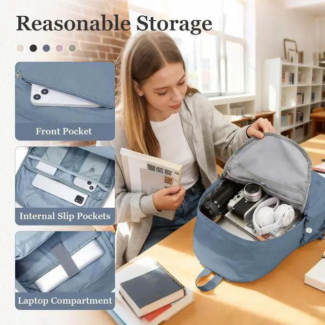 The small zippered pocket on the front of the backpack is convenient for storing personal items, while adjustable pockets on both sides facilitate securing various-sized water bottles to prevent them from falling. The college backpack is designed with an anti-theft zippered pocket for better security of belongings. Additionally, it is equipped with a luggage strap that can be attached to a rolling suitcase, making your travels more convenient and effortless. ^^ The main compartment of the backpack features a 14-inch laptop sleeve (equipped with elastic straps for securing the laptop in place and preventing it from shaking), a tablet sleeve, and two mesh pockets.