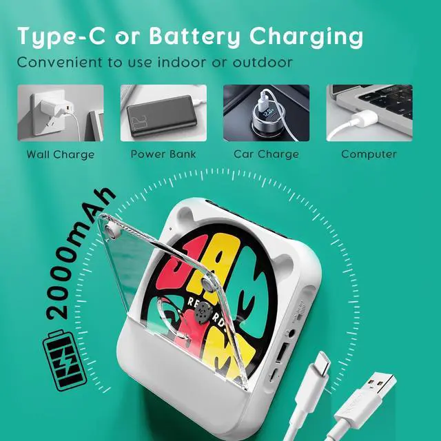SKYANS All-in-One CD Player for Home & Car Experience the ultimate music hub with this versatile CD player. Whether you're relaxing in the living room or heading out for a road trip, its compact, lightweight design makes it the perfect portable CD player for any setting. Seamlessly transition your tunes from your bookshelf to your car's center console for non-stop entertainment ^^ Modern Wireless Freedom with Rechargeable Power Cut the cords and upgrade your listening experience. This CD player portable unit features a powerful built-in 2000mAh rechargeable battery and an advanced Bluetooth transmitter. Effortlessly stream high-fidelity audio from your CDs to your favorite Bluetooth headphones or external speakers.