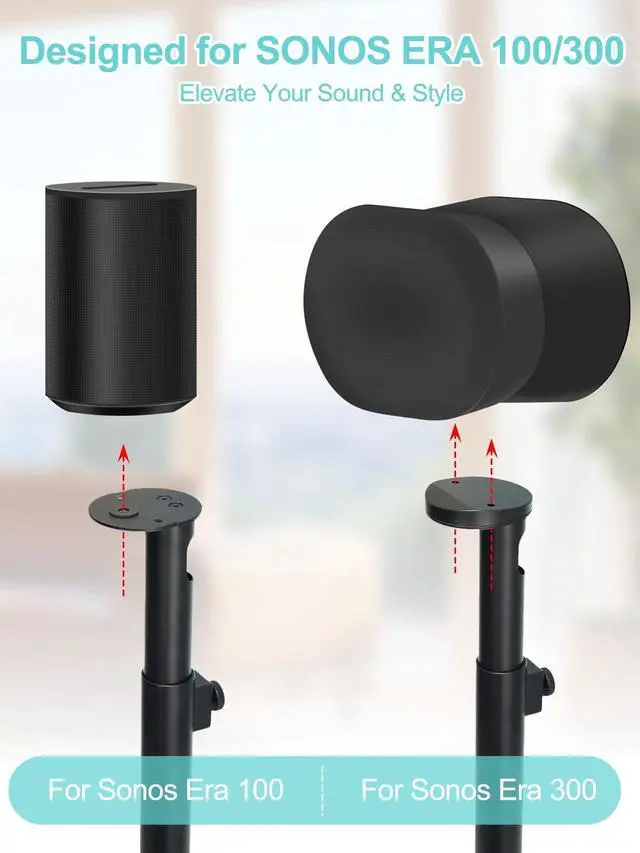 Custom Fit for SONOS ERADesigned specifically for SONOS ERA 100 and SONOS ERA 300 speakers, this stand holds your speakers securely in place. Its shape ensures a stable fit without changing the original appearance of your audio system, so your setup remains clean and well-integrated. ^^ Height Adjustable for Any RoomWith an adjustable height range of 22 to 42 inches, you can position your speakers at the ideal level for any room or listening situation. This flexibility ensures optimal sound projection and a tailored audio experience without compromising your space. ^^ Hidden Cable Management SystemIntegrated channels at the top and bottom of the stand allow power cords and audio cables to be neatly routed inside, keeping your setup organized and reducing visible clutter for a clean, professional look.