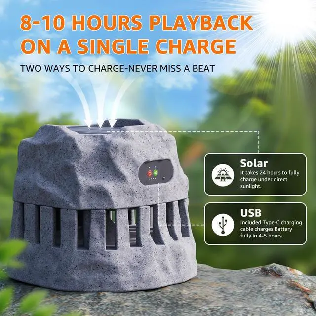 SOLAR-POWERED AND USB-RECHARGEABLE: This solar outdoor speaker features a built-in rechargeable battery that can be efficiently charged via sunlight or USB connection. Once fully charged, it provides up to 50 hours of ambient lighting or 5-8 hours of continuous music playback. ^^