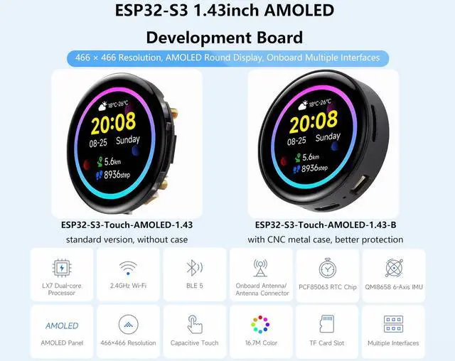 ESP32-S3 1.43 inch AMOLED Development Board (with CNC Metal Case), equipped with high-performance Xtensa 32-bit LX7 dual-core processor, up to 240MHz main frequency. Supports 2.4GH z Wi-Fi ( 802.11 b/g/n) and Bluetooth 5 (LE), with an onboard antenna. ^^ Supports switching to use external antenna via resoldering an onboard resistor. Built-in 512KB SRAM and 384KB ROM, with onboard 16MB Flash and 8MB PSRAM. ^^ Onboard 1.43 inch AMOLED display, QSPI interface, 466 466 resolution. 178 wide viewing angle. Excellent Display Performance, 16.7M color, wide viewing angle.