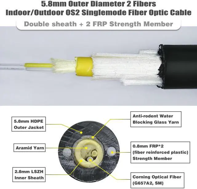 Double Sheatch + 2 FRP Strength: Solidly constructed with Fiber Reinforced Plastic (FRP) strength members and 5.8mm outer diameter UV-resistant HDPE outer jacket + 2.8mm LSZH inner sheath, designed to withstand harsh environments.