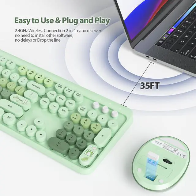 Green Wireless Keyboard and Mouse Combo The cute color & round keys make your desk look so much fun add vitality to your Desktop; Works with your PC, desktop computer, laptop. compatible with Windows 2000 / XP / 7 / 8 / 10/ vista ^^ Easy to Use & Plug and Play- 2.4GH z Wireless Connection35 feet working range, 2-in-1 nano receiver, no need to install other software, no delays or Drop the line, Make your desk surface more neat and tidy, Keyboard or mice can be used separately, just insert a single USB Receiver to use your Wireless Keyboard Mouse Combo ^^ 13 Multimedia Hot KeysThis wireless typewriter keyboard has 13 multimedia hotkeys for one-touch commands to enhance your productivity.