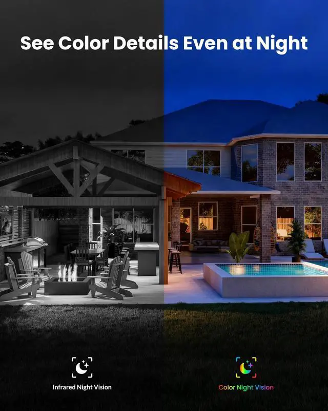 Night: Equipped with a 5MP ultra-high-definition camera, delivering sharper images than standard 1080P cameras. Full-color night vision ensures enhanced visibility after dark, allowing you to clearly identify people, vehicles, and activities even in low-light conditions. ^^ Smart Motion Detection with Sound & Light