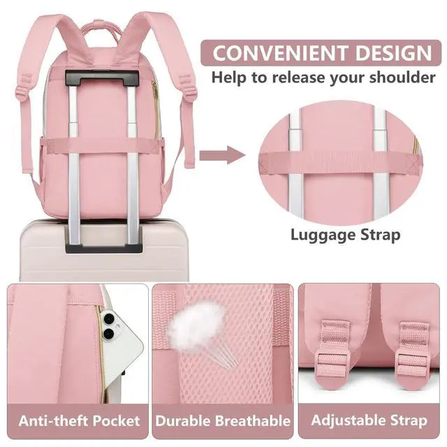 Large Capacity Backpack with Laptop Compartment- This laptop backpack features 4 compartments 26 pockets totally. The laptop compartment fit for 15.6 inch computer/chromebook. The main compartment holds A4 folders, binders, work documents, clothes and other daily necessities. 3 front pockets for small items such as iPad, cell phones, chargers, keys, pens, wallets, etc. 2 sides pockets can hold a 32oz water bottle and umbrella easily and more for a 3 day weekend ^^ Convenient Luggage Strap & Anti-theft Design- The luggage strap on back of women bookbag allows it to fit on suitcase handle, freeing your hands on a business trip.
