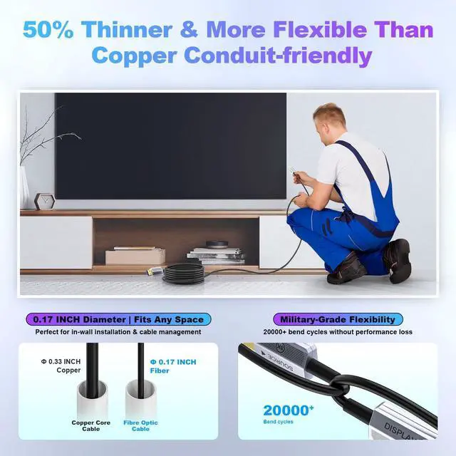 8K/4K Ultra HD Over Long DistancesDelivers flawless 4K@120Hz, 8K@60Hz, and HDR signals up to 1000ft+ without signal degradationunlike copper cables that lose quality beyond 15ft. ^^ HDMI 2.1 ^^ 48Gbps BandwidthSupports 8K@60Hz, 4K@120Hz, VRR, ALLM, and eARC for next-gen gaming (PS5/Xbox Series X) and home theater setups. Fully future-proof for 8K TVs and GPU ^^ Zero Interference ^^ Perfect for Complex SetupsFiber optic technology eliminates EMI/RFI noise from power cables, speakers, or Wi-Fi routersideal for professional AV racks and crowded wiring ^^ Ultra-Thin & Flexible Design50% thinner and lighter than copper cables, with 360 bendability for easy in-wall conduit routing or tight spaces behind TVs ^^ Durable & Low MaintenanceNo copper oxidationlasts for decades.