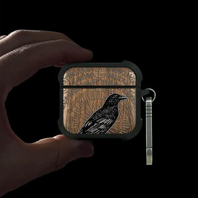 Patterit for AirPods 4 Case (2024) (USB-C), Shockproof Cover with Quick Released Keychain, Compatible with AirPods 4th Generation, Natural Wood Hand-Drawn (Raven of Prophecy) Walnut