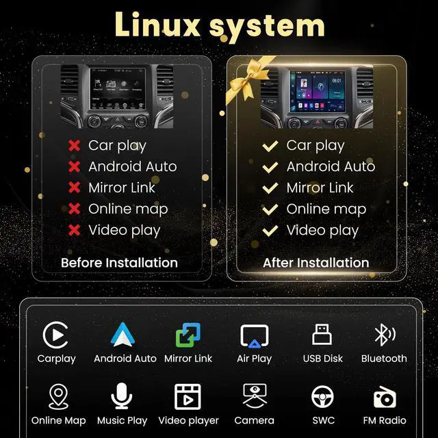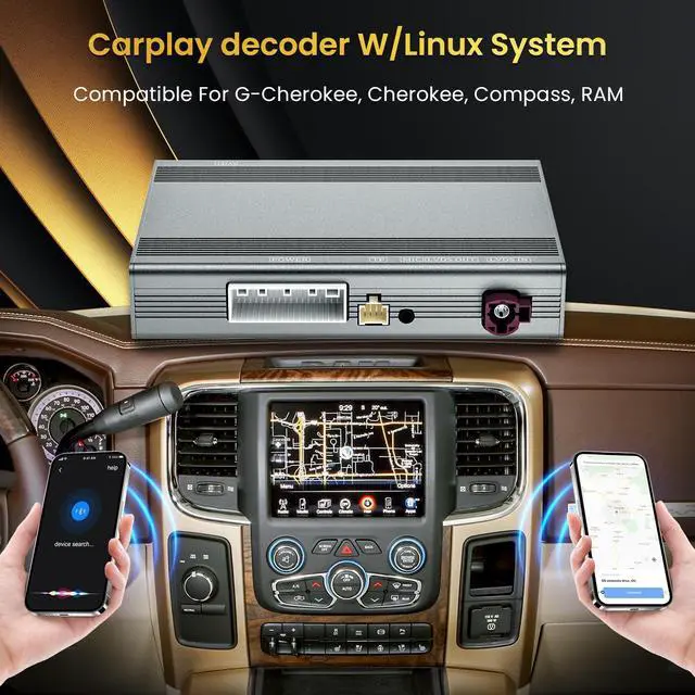 NoticePlease note before purchasing. It's a CarPlay Decoder adapter Retrofit kit not a display screen. This Linux Interface Box suitable for Jeep Cherokee Compass RAM ^^ Powerful & multiple functionsLinux Interface Box will retain original car radio system and will Linux system, it can support wireless apple carPlay and android auto GPS navigation and mobile phone Bluetooth music. steering wheel control, rear view, original car functions ^^ Wireless & wired Carply and Andriod AutoThe Product Supports Bluetooth Connection and USB cable connection For Carplay/Android Auto, Allowing Users To Mirror Their Phone Content Onto The Screen.