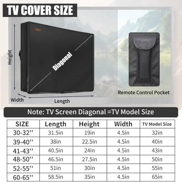 TVs: 38''L x 22.5 ''H x 4.5"W, DIAGONAL LENGTH=SIZE OF TV=40". Please measure the external dimensions of your TV including frame before purchasing to ensure compatibility. Make sure all parts are fully covered to provide the best protection. Fits most brands of LCD LED flat screen TVs. ^^ 600D